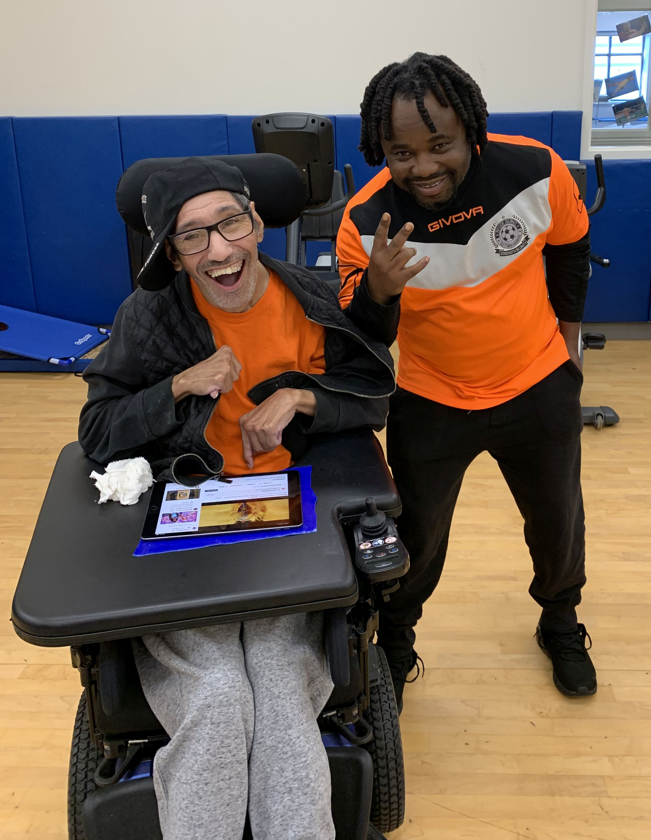 In the therapy room, Scott provides one-on-one exercise programs focused on strength training and flexibility. Another big focus is helping our individuals use the sit to stand machine, which gives many folks a chance to get out of their wheelchairs and work on weight bearing exercises. Participants say they enjoy it because it gives them a great stretch and boosts their self-confidence. In the future, we hope to implement more group exercise programs focused on sports like volleyball, basketball, and soccer, as well as general fitness movements.