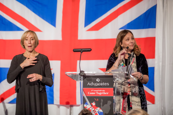 Advocates president and CEO, Diane Gould, thanked sponsors and guests, commenting with “we all get by with a little help from our friends.” She remarked, “The lyrics of this song, and many others from the British Invasion, really capture what Advocates is all about. Relying on our friends when we are lonely and feeling down. Giving others encouragement when they need to get their feet back on the ground. And believing that everyone needs and deserves somebody to love.”